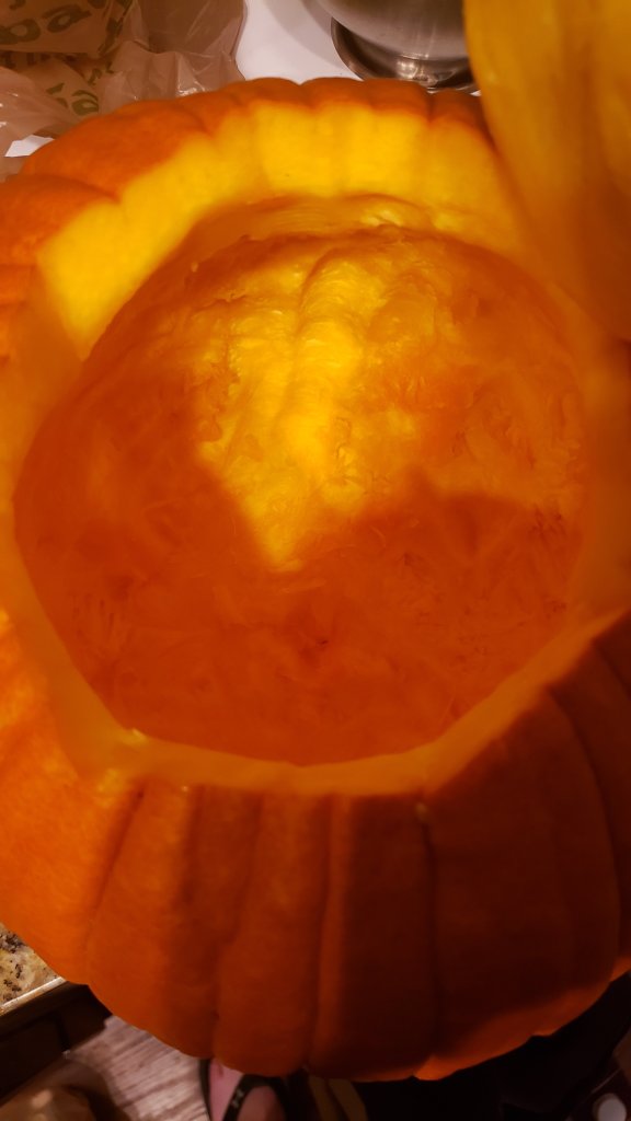 Now the fun part – stuff the pumpkin full of all your ingredients and put that thing in a roasting pan, into the oven at 400°F for 1.5 hours.