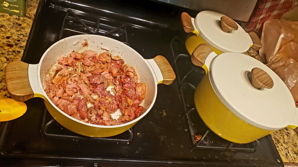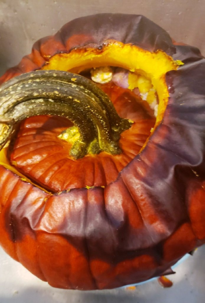 I threw all that in a deep sauce pan, cooked the meat thoroughly, softened the potatoes in some boiling water, and added it all to the pumpkin to roast.
