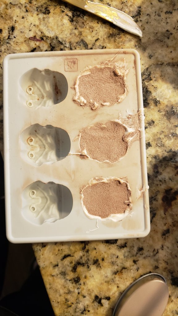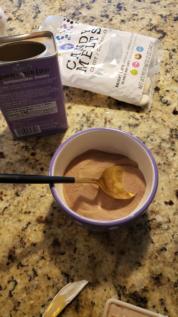 Add the hot chocolate mix, but not too full, because you’ll have to top off the back of the mold with the residual candy melts.